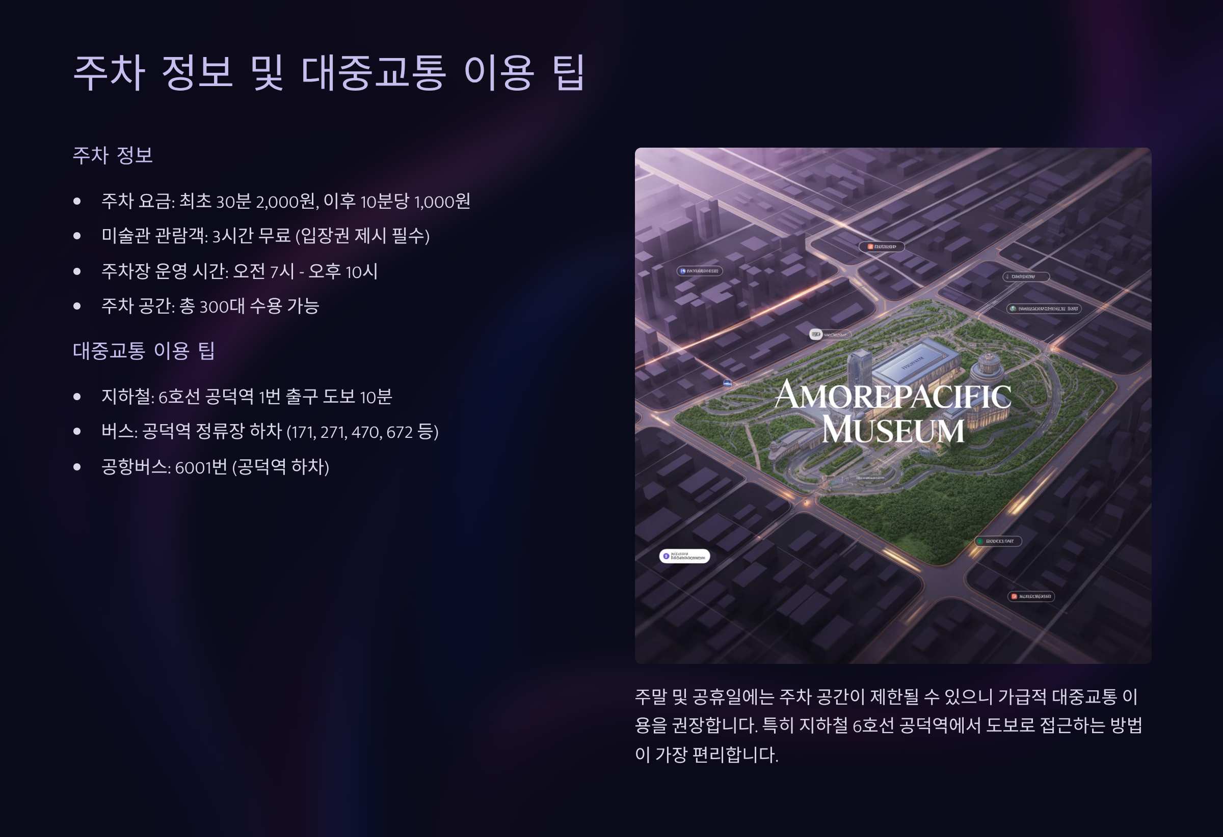 주차 정보 및 대중교통 이용 팁