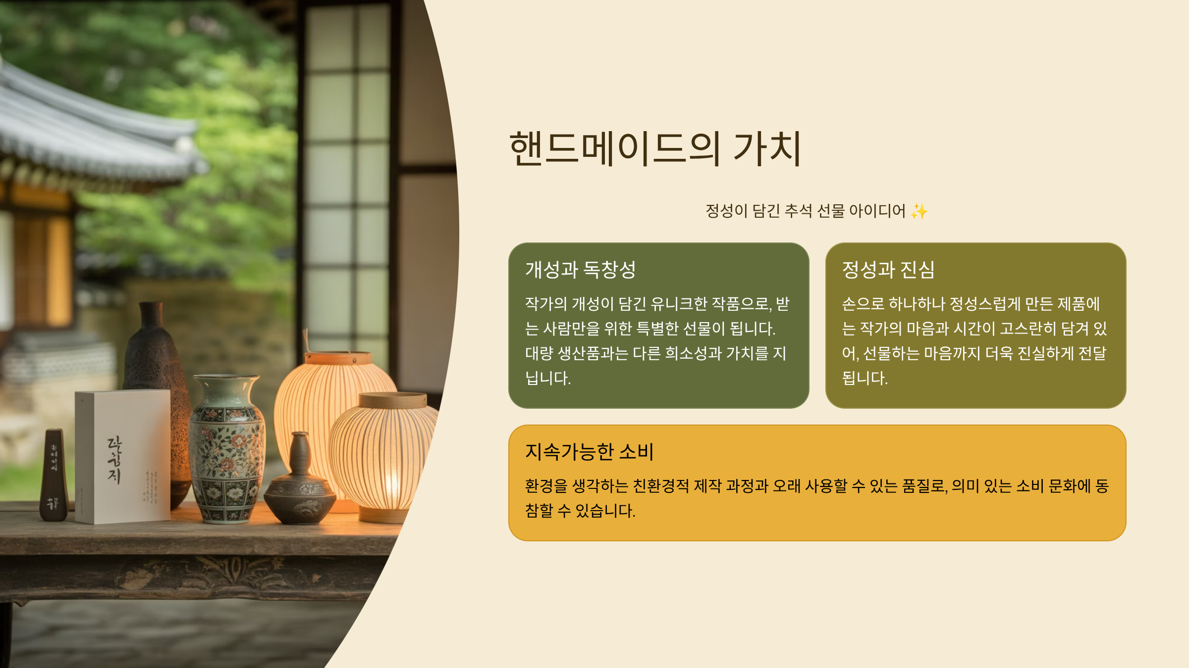 추석 선물 추천 보러가기 👉핸드메이드의 가치: 정성이 담긴 추석 선물 아이디어 ✨