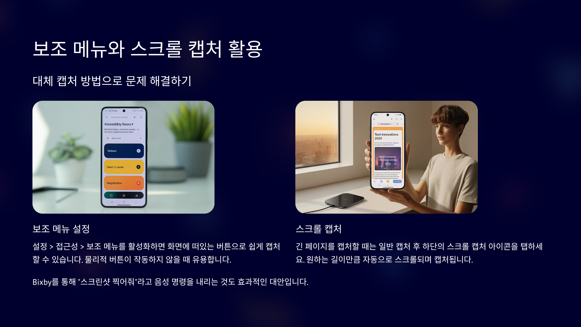 보조 메뉴와 스크롤 캡처는 특히 물리적 캡처 방식에 어려움을 겪는 사용자에게 매우 유용합니다.