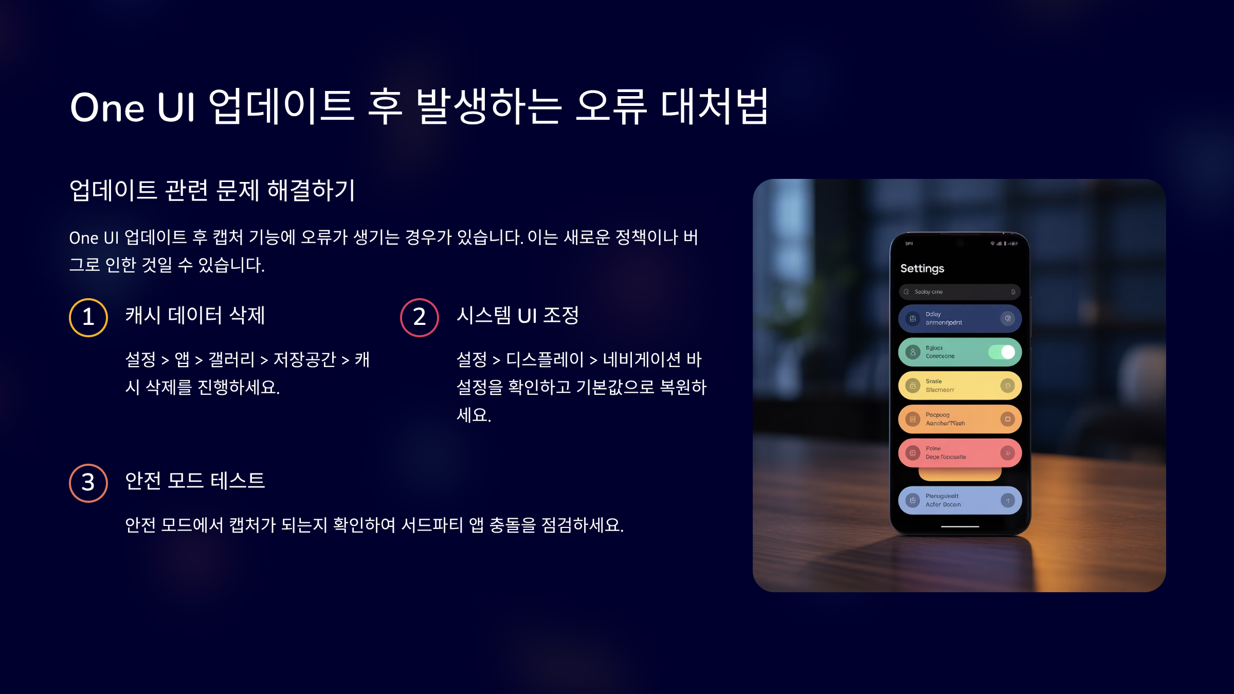 새로운 One UI 버전으로 업데이트한 후, 갑자기 캡처 기능에 문제가 생기는 경우가 있습니다. 이는 업데이트 과정에서 시스템 파일이 충돌하거나, 기존의 설정값이 제대로 마이그레이션되지 않았을 때 발생할 수 있는 현상입니다. 이럴 때는 단순히 재부팅하는 것을 넘어, 삼성 캡처 앱의 데이터 및 캐시를 삭제하는 것이 효과적인 해결책이 될 수 있습니다. 이는 마치 컴퓨터의 프로그램 오류를 해결하기 위해 임시 파일을 삭제하는 것과 비슷한 원리입니다.