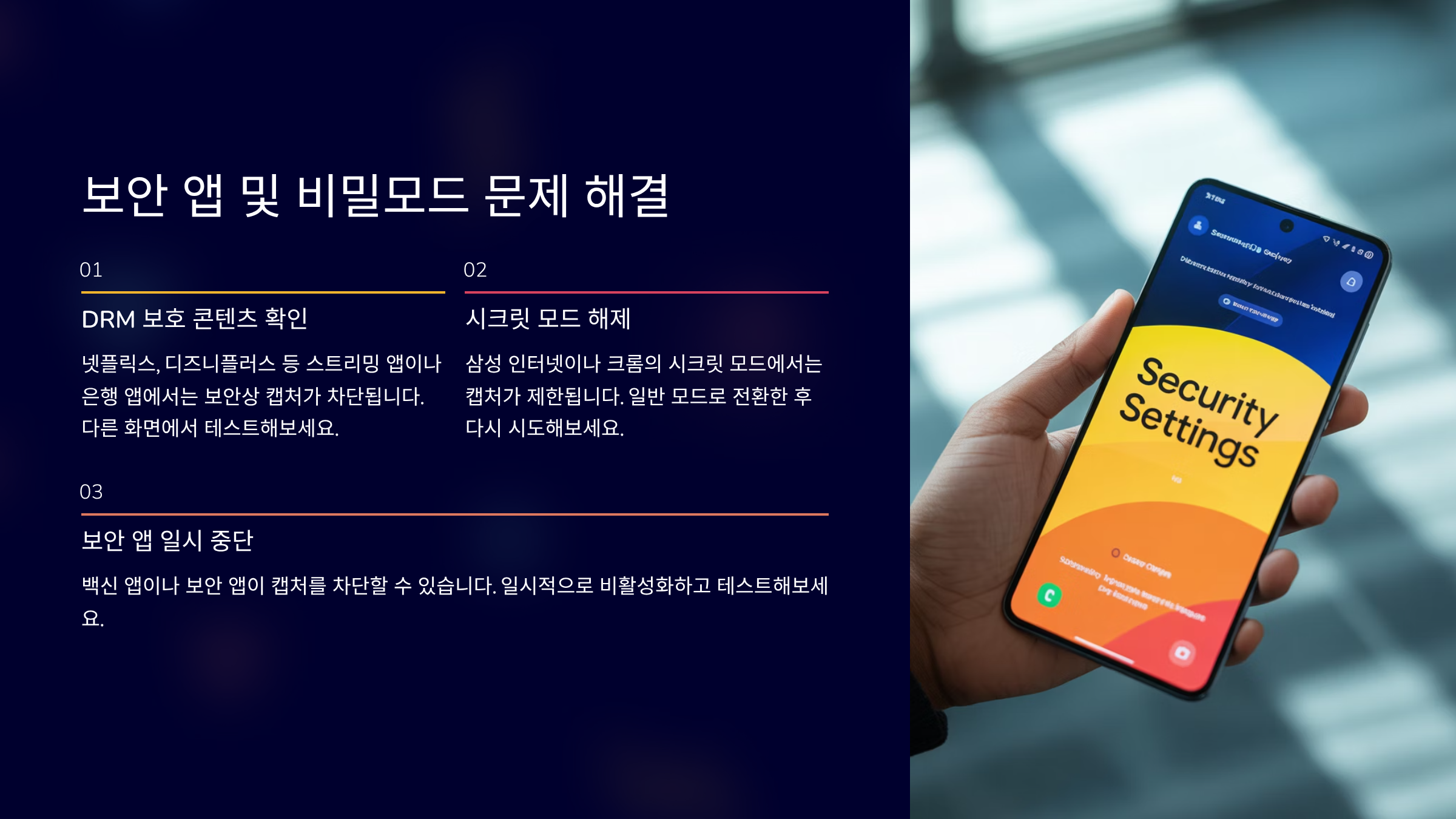 갤럭시 캡처가 안 될 때, 의외로 많은 분들이 간과하는 원인이 바로 보안 관련 앱이나 설정입니다. 금융 앱이나 일부 기업용 앱은 물론, 삼성 인터넷의 '비밀 모드'에서도 화면 캡처가 제한될 수 있습니다. 특히 비밀 모드는 사용자의 인터넷 사용 기록을 남기지 않기 때문에, 그 안에 있는 콘텐츠도 보호되는 것이죠. 만약 삼성 인터넷에서 캡처가 안 된다면, 비밀 모드 설정에서 '비밀 모드에서 화면 캡처 허용' 옵션이 켜져 있는지 확인해보는 것이 좋습니다.