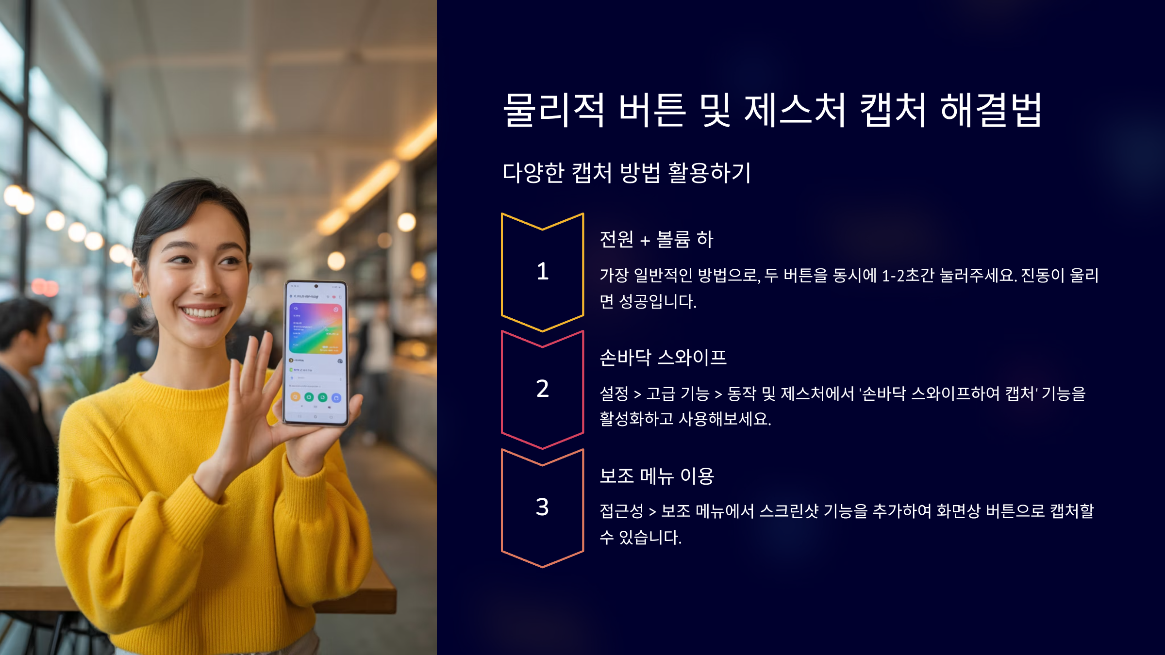 가장 일반적인 캡처 방법인 '측면 버튼 + 볼륨(하) 버튼' 조합이 작동하지 않을 때는, 버튼을 누르는 타이밍을 다시 확인해 보세요. 이 두 버튼을 동시에 짧게 눌렀다 떼는 것이 핵심입니다. 만약 너무 길게 누르면 전원 끄기 메뉴가 나타나고, 동시에 누르지 않으면 볼륨 조절 바가 올라오게 됩니다. 여러 번 연습해서 정확한 타이밍을 익히는 것이 중요합니다. 이 방법이 계속 실패한다면, 손으로 밀어서 캡처하는 제스처 기능이 활성화되어 있는지 확인해 볼 수 있습니다.
