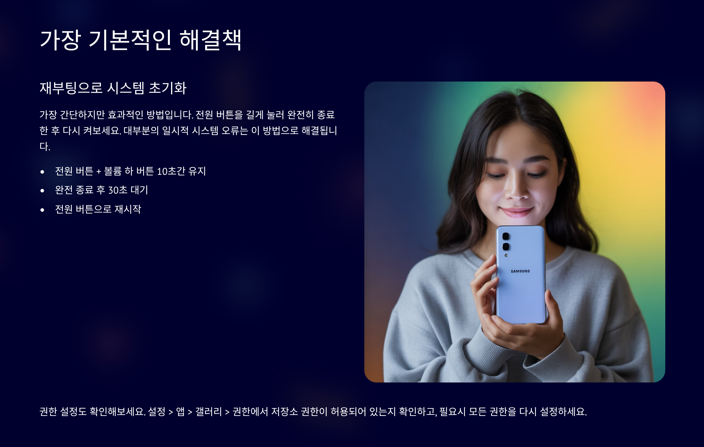 A: 가장 간단한 재부팅부터 시작해서, 권한 확인, 앱 설정 변경, 소프트웨어 업데이트 순으로 진행하는 것을 추천합니다.