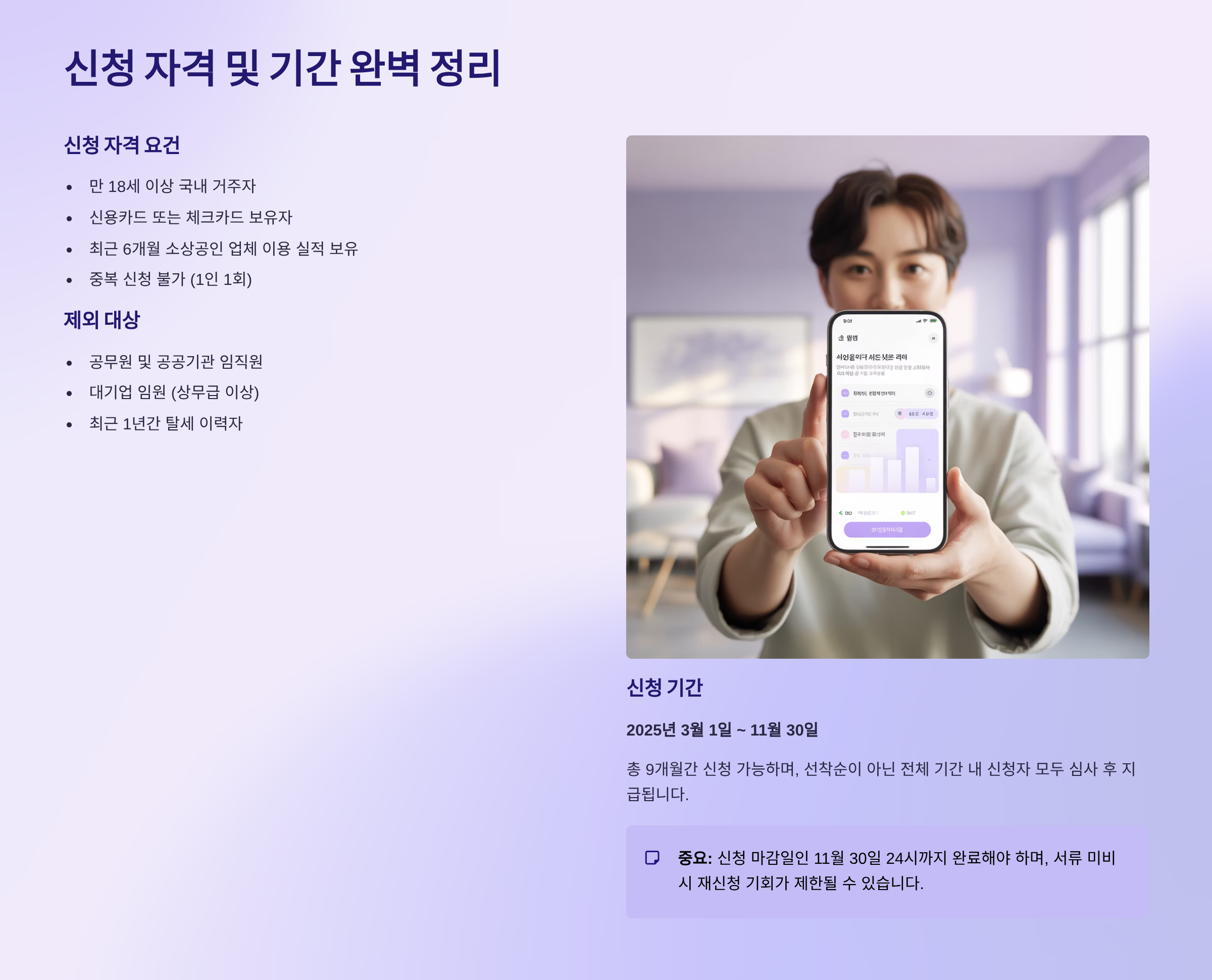 **신청 기간**은 **2025년 9월 15일(월) 오전 9시부터 11월 30일(일) 자정**까지입니다. 이 기간 내에 **단 한 번**만 상생페이백 누리집(상생페이백.kr)을 통해 온라인으로 신청하면, 9월, 10월, 11월 세 달간의 소비 증가분이 모두 자동으로 적용됩니다. 즉, 9월 초에 신청했든, 11월 말에 신청했든 혜택 적용 기간은 9월부터 시작되므로 늦게 신청하더라도 9월 소비분까지 **소급 적용**됩니다. 하지만 시스템 점검 시간인 23:30부터 다음 날 00:30까지는 신청이 불가하니 유의해야 합니다. 신청 초기에는 접속자 폭주를 막기 위해 출생연도 끝자리에 따른 **5부제**가 시행되었지만, 현재는 제한 없이 누구나 신청할 수 있도록 해제되었으니 언제든 접속하여 신청하시면 됩니다.