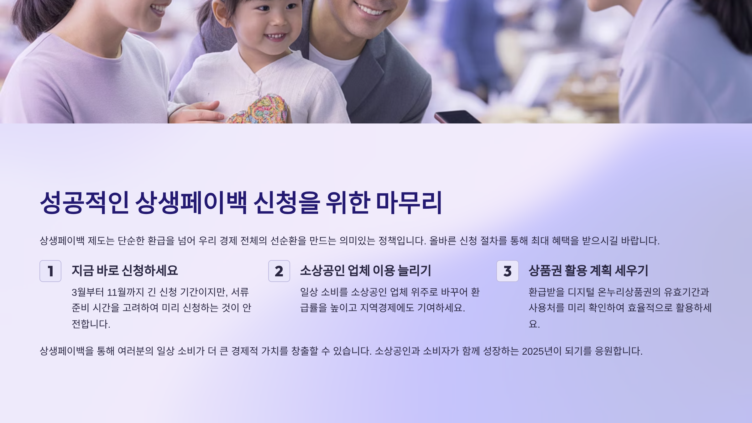 상생페이백의 성공적인 신청과 혜택 극대화를 위해서는 무엇보다 **정확한 정보 습득**이 중요합니다. 특히 환급액 계산 방식, 제외되는 사용처, 그리고 신청 기한을 정확히 파악해야 합니다. 신청을 하지 않으면 아무리 소비를 많이 늘려도 환급을 받을 수 없기 때문에, 지금 바로 온라인 신청 절차를 확인하고 실행하는 것이 가장 현명한 방법입니다. 신청은 단 한 번만 하면 3개월 치 소비가 모두 자동 적용된다는 점도 꼭 기억해 두세요.