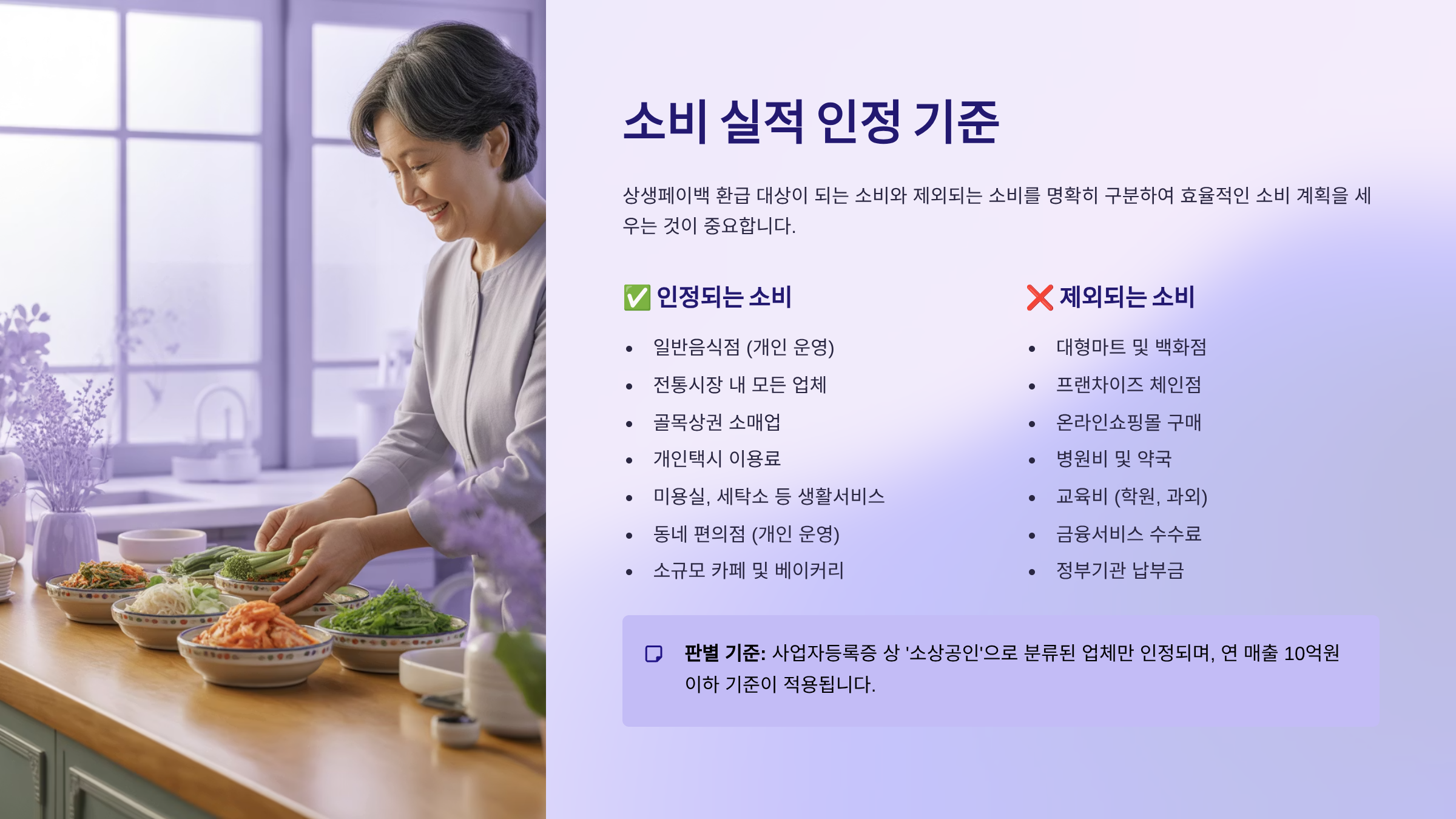 이처럼 실적 인정 여부를 결정하는 가장 중요한 기준은 **'소상공인 지원'**입니다. 따라서 프랜차이즈 매장이라도 **개별 가맹점**에서 사용한 금액은 대부분 인정되지만, 본사가 운영하는 **대기업 직영점**은 제외되는 경우가 많습니다. 카드 결제를 취소하거나 환불하면 해당 금액만큼 실적에서 제외되고, 이미 지급된 페이백은 환수될 수 있다는 점도 반드시 염두에 두어야 합니다. 따라서 환급 기간 동안은 가급적 충동적인 구매나 취소를 최소화하는 것이 좋습니다.
