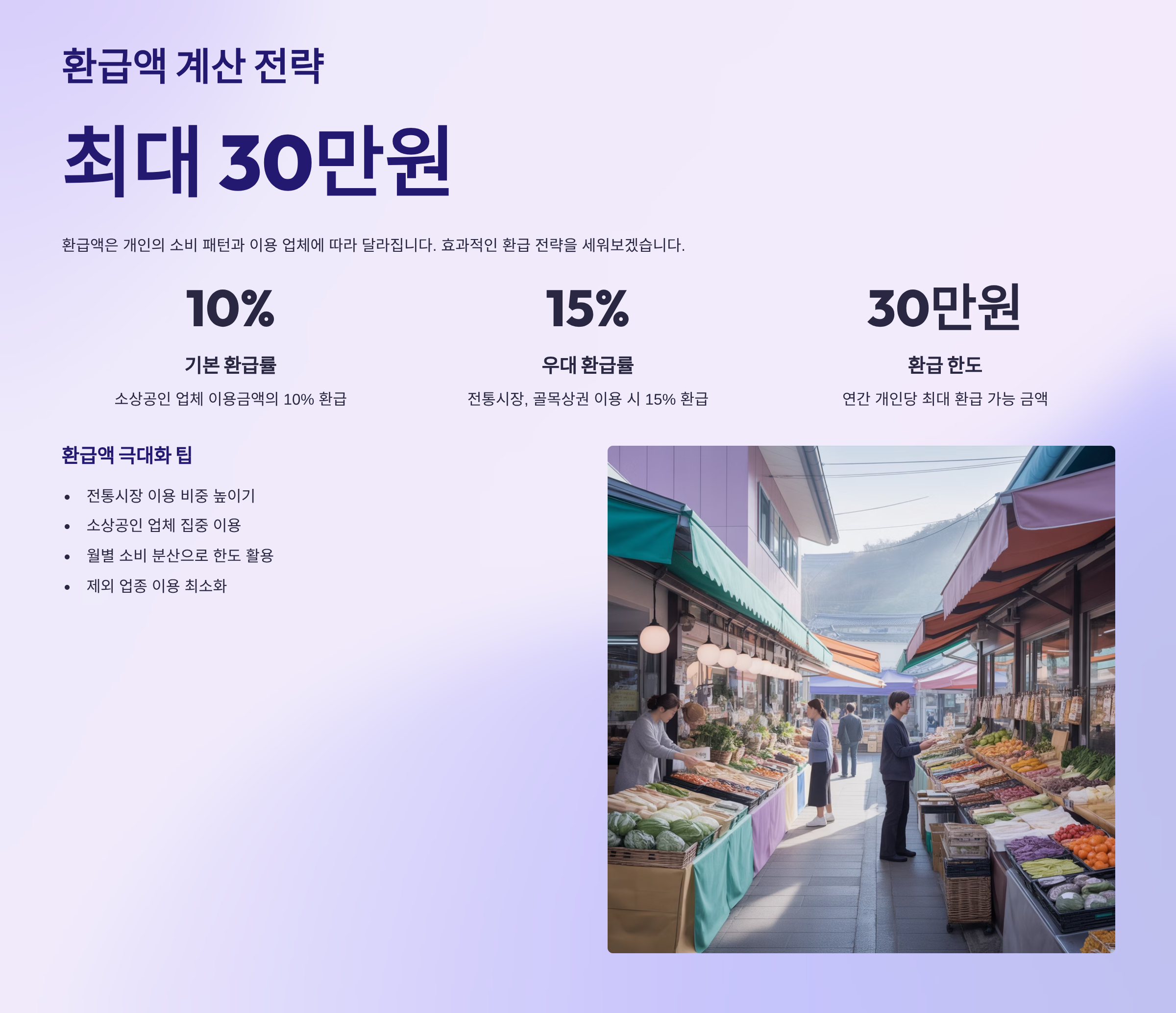 이처럼 **상생페이백** 제도는 본인의 소비 패턴을 정확히 분석하고 계획적으로 지출을 늘릴 때 가장 큰 혜택을 볼 수 있습니다. 환급액은 매월 15일에 지급되며, 이 금액을 다시 소상공인 매장에서 활용함으로써 개인의 혜택과 지역 경제 활성화에 기여하는 **선순환 구조**를 완성할 수 있습니다.
